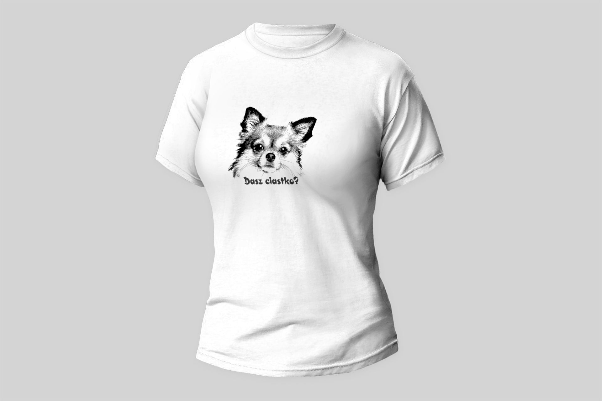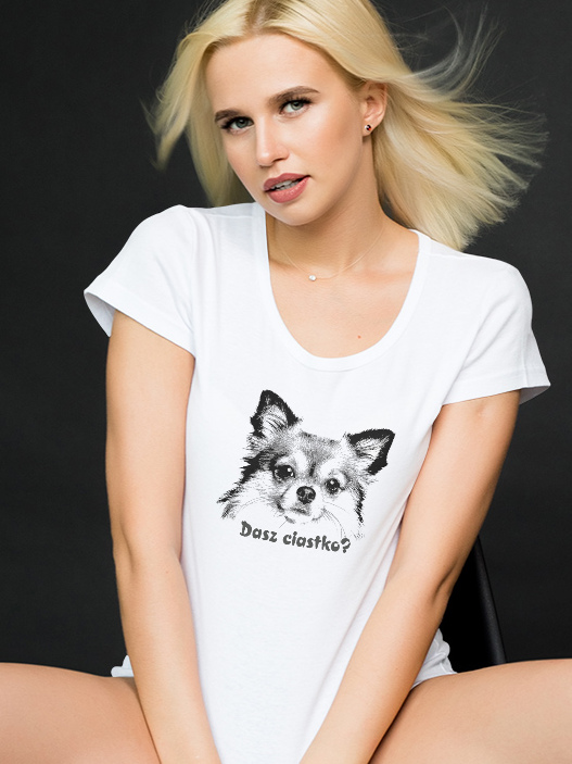 Damski t-shirt Psioszulka - Dasz ciastko? Koszulka ze szkicem chihuahua i śmiesnym tekstem to doskonała opcja na połączenie jej z jeansowymi szortami, zwykłymi spodniami oraz spódniczką. Psioszulka świetnie wpasuje się w codzienny styl każdej psiolubnej osoby.