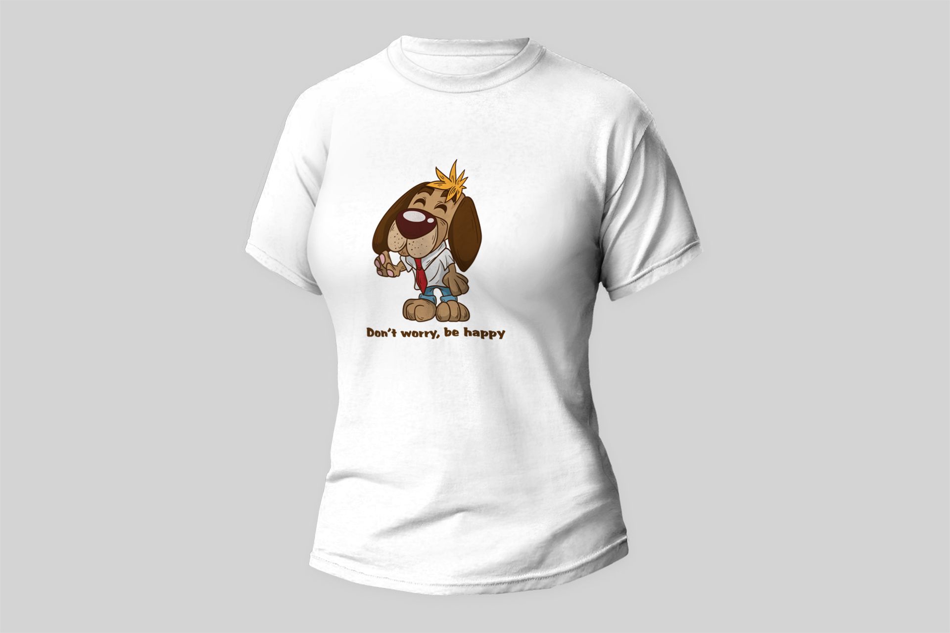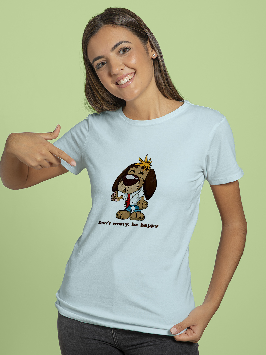 Damski t-shirt Psioszulka - Don't Worry, Be Happy! Śmieszna grafika psa to doskonała opcja na połączenie jej z jeansowymi szortami, zwykłymi spodniami oraz spódniczką. Psioszulka świetnie wpasuje się w codzienny styl każdej psiolubnej osoby.
