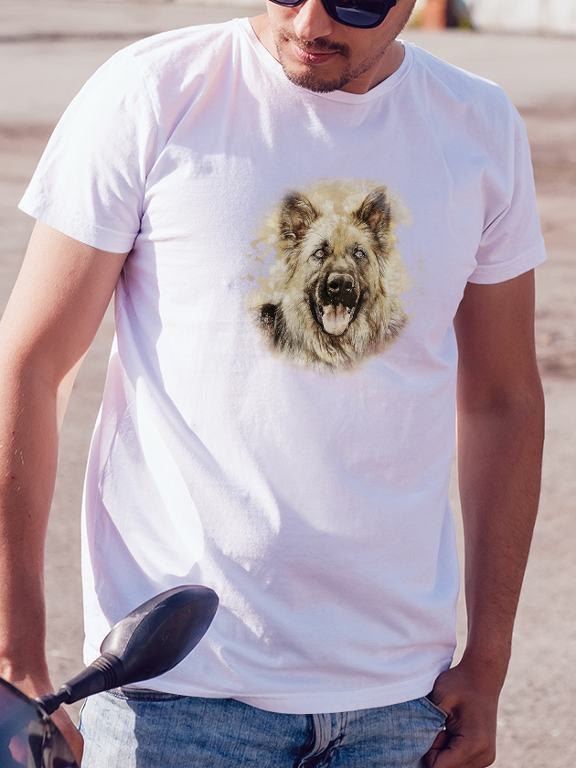 Męski t-shirt Psioszulka - owczarek niemiecki długowłosy - koszulka z portretem to doskonała opcja na połączenie jej z jeansowymi szortami, zwykłymi spodniami. Psioszulka świetnie wpasuje się w codzienny styl każdej psiolubnej osoby.